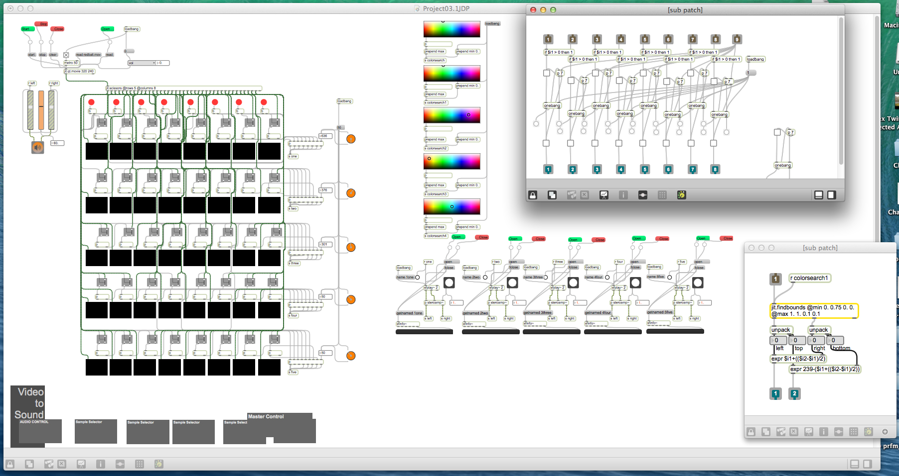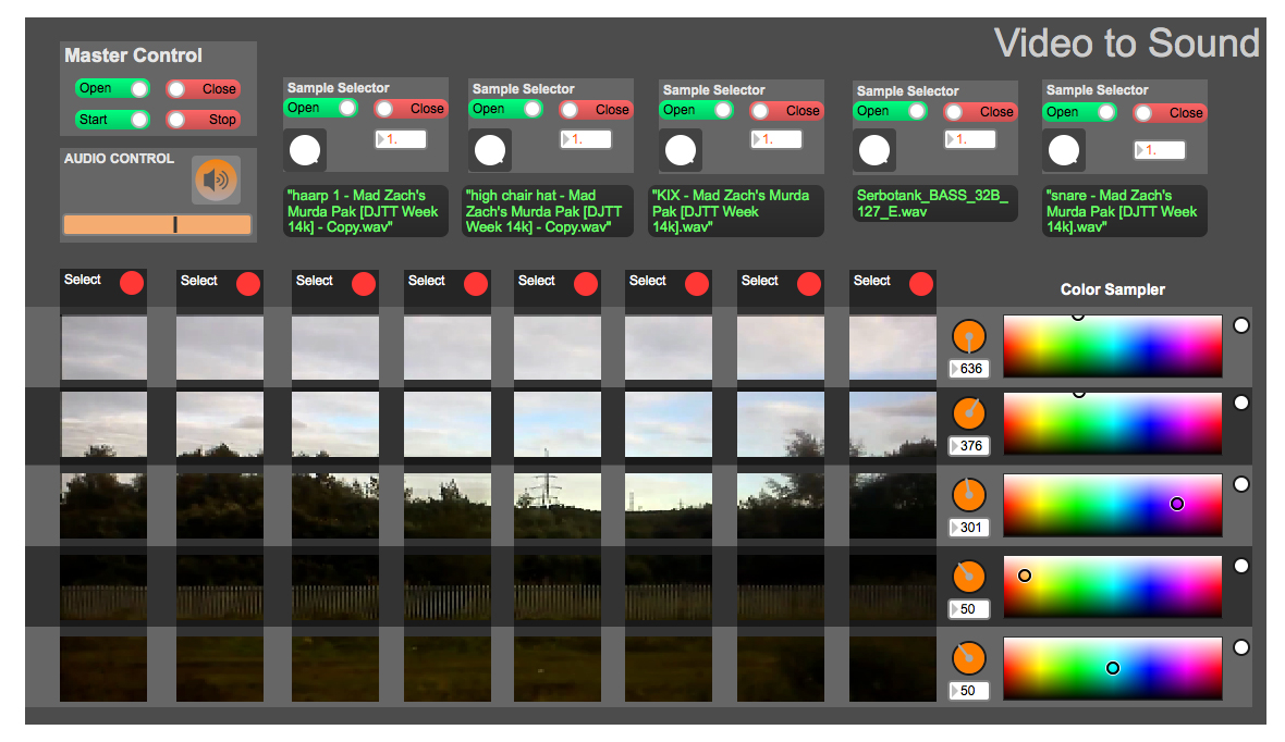Second project is an audio visualizer, and attempted to sample a video for colors and then play audio samples based on if that color was present in the video. You can adjust the frequency of each beat allowed to play by ether choosing a column of the video or changing the dial next to the sample to slow the fire rate of each sample.